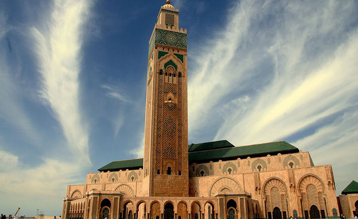 The Hassan II Mosque in Casablanca, built to commemorate the 60th birthday of former Moroccan King Hassan II in 1989, is the largest religious building in Africa, which can accommodate over 100,000 worshippers in its grounds. The 210 meter minaret is the tallest in the world and is visible day and night for miles around. Designed by the French architect Michel Pinseau, the mosque stands on a promontory looking out to the Atlantic; almost half of the surface of the mosque lies over the Atlantic Ocean, which is visible through the glass floor.