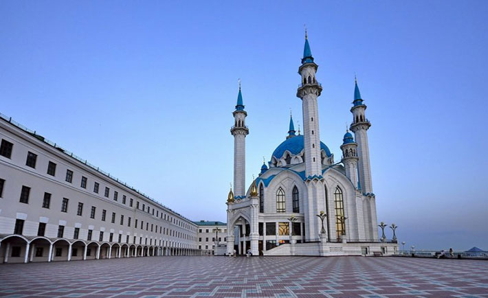 The Qol Sharif mosque, in Kazan is the largest mosque in Russia. It opened on June 24, 2005 as part of the festivities marking the city’s 1,000th anniversary in the presence of leaders of the Islamic world. The white-and-blue mosque is built on the site where the old Qol Sharif Mosque once stood. The latter was destroyed along with hundreds of other mosques in the region after the Russian conquest of Kazan in 1552.
